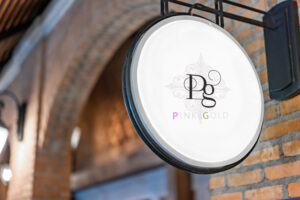 The Circle white Lightbox has hung on the wall in front of the brick pole in a Tungsten ambient environment vintage shopping community mall.
